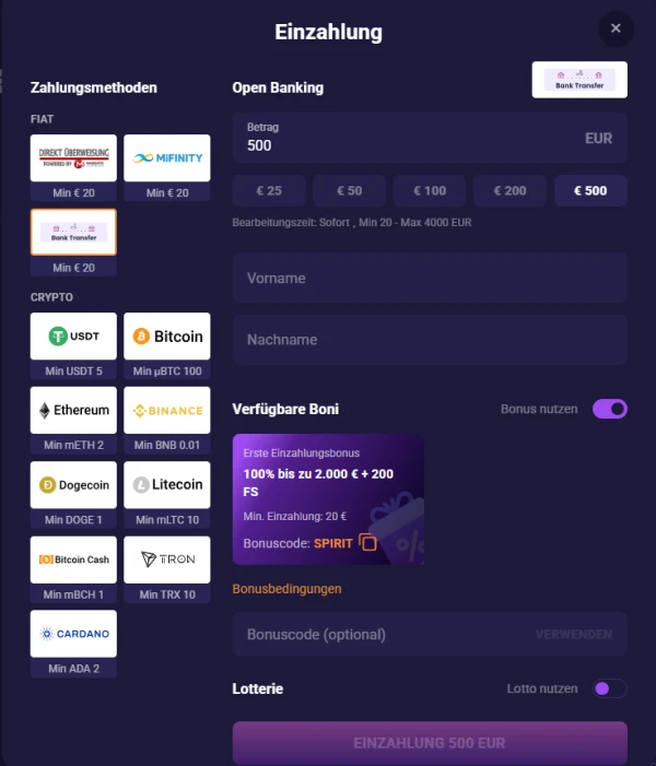 Um Guthaben einzuzahlen, öffnen Sie die Kasse in Ihrem Spiritcasino Casino-Konto, wählen Sie eine Zahlungsmethode und bestätigen Sie den Betrag in EUR. Für Spieler aus Österreich werden Kartenzahlungen, EPS, Klarna (Sofort) und E-Wallet-Einzahlungen sofort verarbeitet, und Krypto-Einzahlungen werden gutgeschrieben, sobald sie im Netzwerk bestätigt sind. Prüfen Sie immer Minimum und Maximum pro Methode, bevor Sie absenden, besonders bei Paysafecard und einigen Wallets.