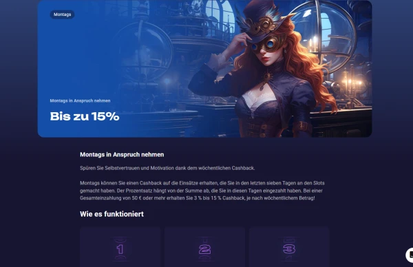 | Wöchentliches Cashback | 3% bis 15% zurück auf wöchentliche Slot-Verluste | Gilt für Slots; Quote hängt von Wochenaktivität und Verlusthöhe ab |