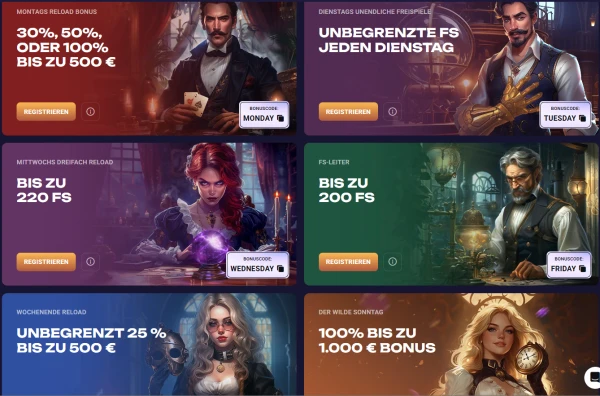| Freitag Freispiele | Bis zu 100 Freispiele jeden Freitag | Freispiele-Anzahl hängt von den Wochenaktionsbedingungen und der Berechtigung ab |