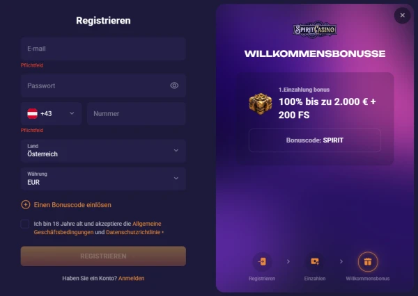 Ein Profil bei Spiritcasino online zu erstellen dauert nur ein paar Minuten und hilft uns, Zahlungen und Limits der richtigen Person zuzuordnen. Folgen Sie diesen Schritten, um Ihr Spiritcasino-Konto zu eröffnen und zu spielen, sobald Sie bereit sind, mit echtem Geld einzusetzen. Bitte beachten Sie: Wir bewerben keinen Spiritcasino Bonus ohne Einzahlung, und in unseren aktuellen Aktionen ist nach der Registrierung kein Bonus ohne Einzahlung aufgeführt.