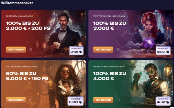 Unser Willkommensangebot ist in vier Einzahlungen aufgeteilt, damit Sie die Rewards über Zeit statt auf einmal erhalten. Die erste Einzahlung bringt 100% Bonus bis zu €2000 plus 200 Freispiele und startet ab einer Mindesteinzahlung von €20 mit 40x Umsatz. Ihre zweite Einzahlung bringt weitere 100% bis zu €3000 mit derselben Mindesteinzahlung von €20 und 40x Umsatz. Bei der dritten Einzahlung erhalten Sie 50% bis zu €6000 plus 150 Freispiele, erneut ab €20 mit 40x Umsatz, und die vierte Einzahlung kehrt zu 100% bis zu €4000 ab €20 mit 40x Umsatz zurück. Wenn Sie jeden Spiritcasino Bonus vergleichen, achten Sie vor allem auf die Umsatzanforderung sowie darauf, wie Freispiele gutgeschrieben und genutzt werden.