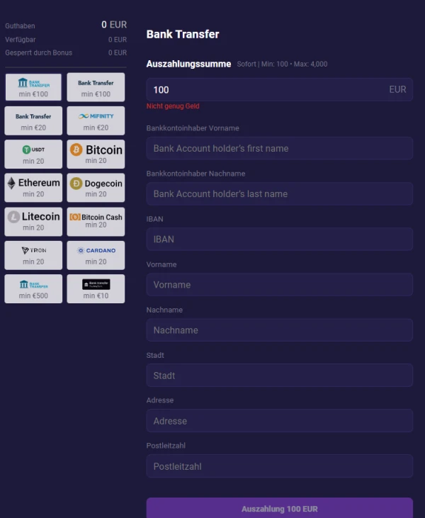 Standardmäßig können Sie bis zu €3.000 pro Woche und €15.000 pro Monat auszahlen. VIP-Spieler erhalten höhere Limits. Die Mindestauszahlung beträgt €20, bei Banküberweisung €200.
